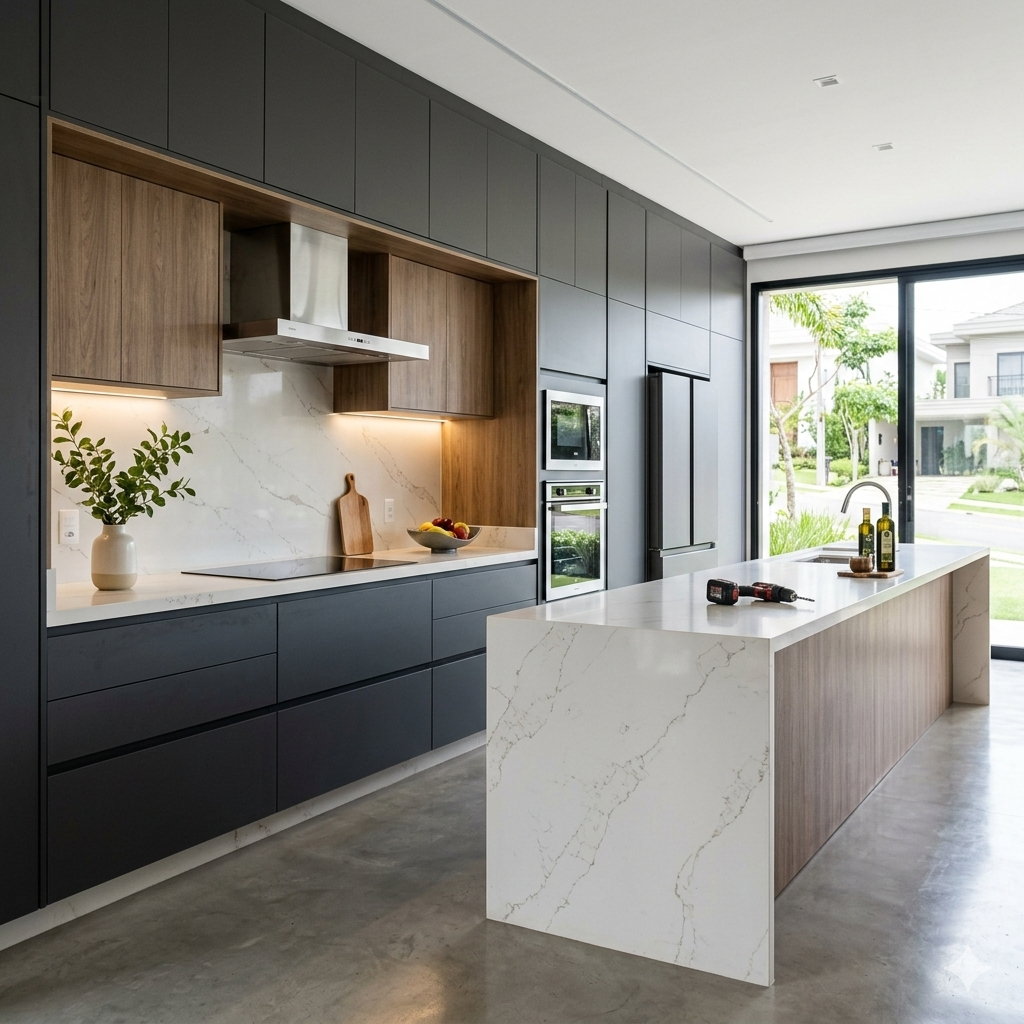 • Ferragens de Performance: Dobradiças com sistema Soft Close (amortecimento para evitar batidas), corrediças telescópicas invisíveis de extração total e pistões a gás reforçados para portas basculantes.